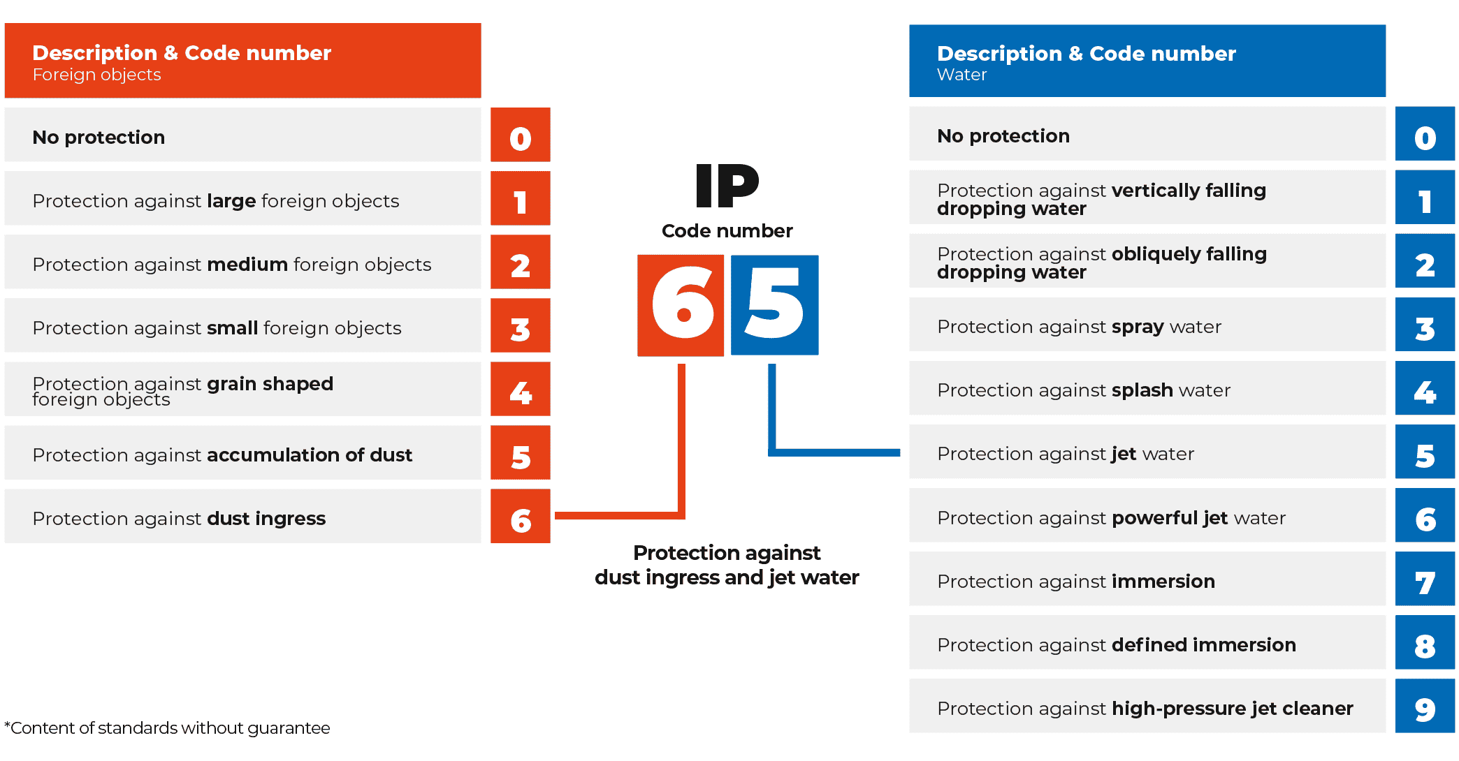 The so-called IP code comes from the English language and means “Ingress Protection ”. The protection classes are regulated in ISO 20653 or DIN EN 60529 and consist of 2 code numbers.